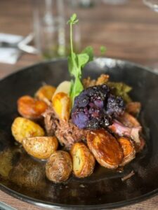 - Paleron de bœuf confit aux oignons, pommes de terre grenailles, légumes rôtis – 22€
