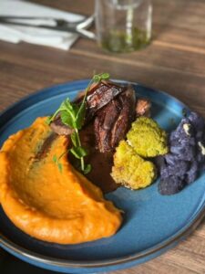 - Magret de canard cuisson basse température, jus au vin et cacao, mousseline de patate douce, légumes de saison – 28€